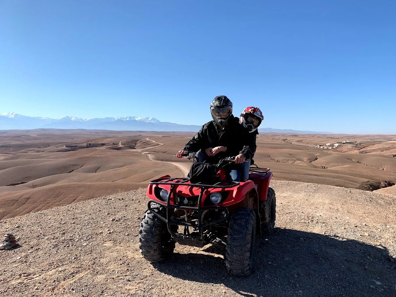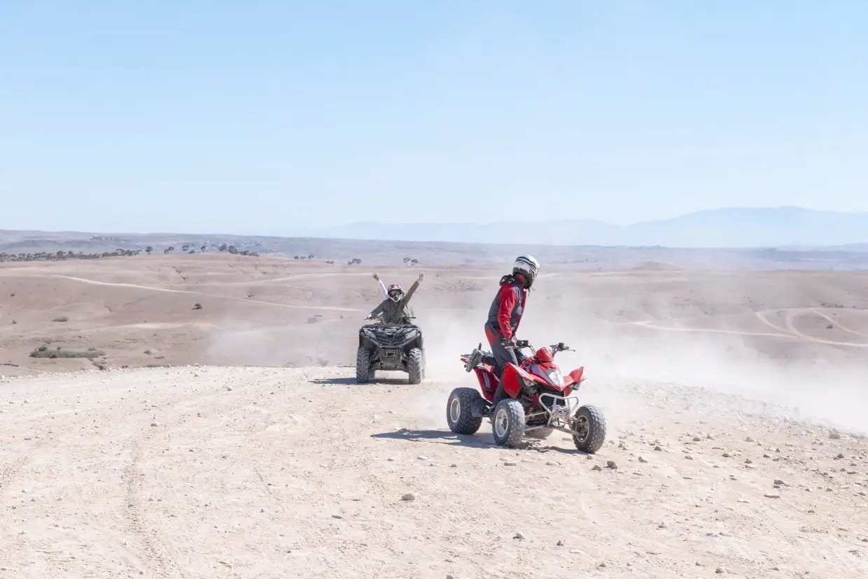 Located only 40 minutes from Marrakech, the Agafay Desert offers wide open spaces, rocky hills, and breathtaking views of the Atlas Mountains. Riding a quad bike allows you to explore these landscapes while enjoying a unique outdoor adventure.